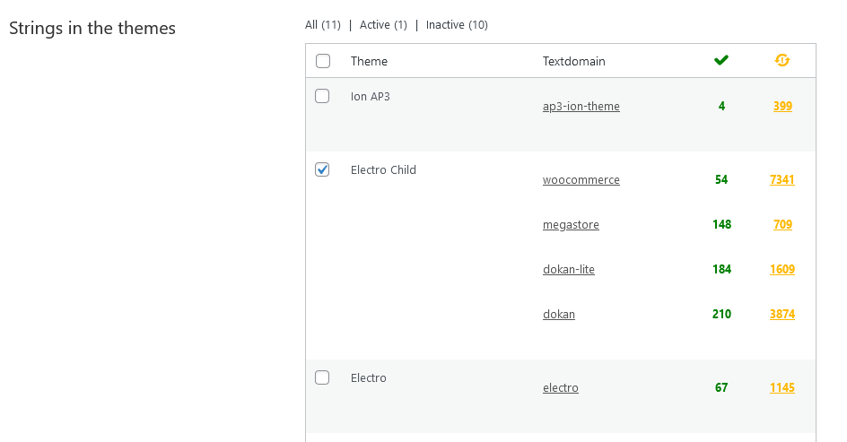 2- Select your Child Theme checkbox in the "Strings in the themes" and click on "Scan Selected Themes for String" to start scanning for new strings