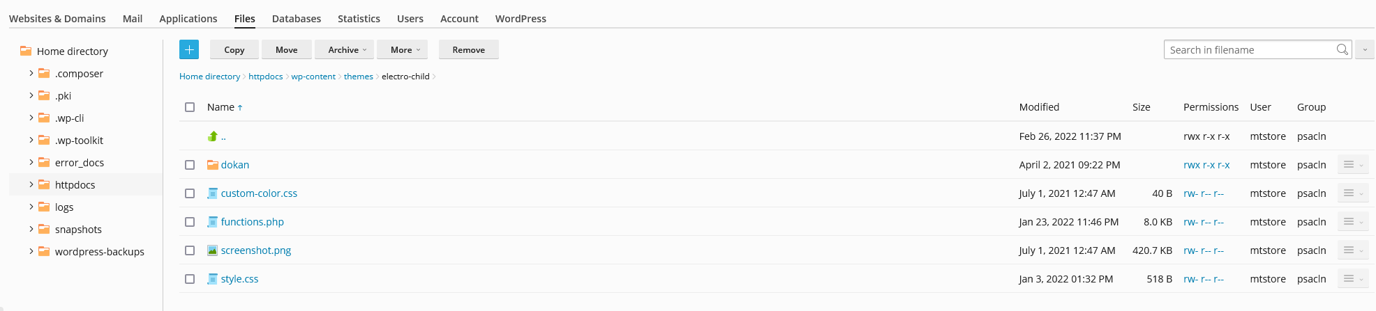 2- Click on Files on the top bar menu to go to the file manager page and navigate to httpdocs/wp-content/themes/Your Theme-child/functions.php