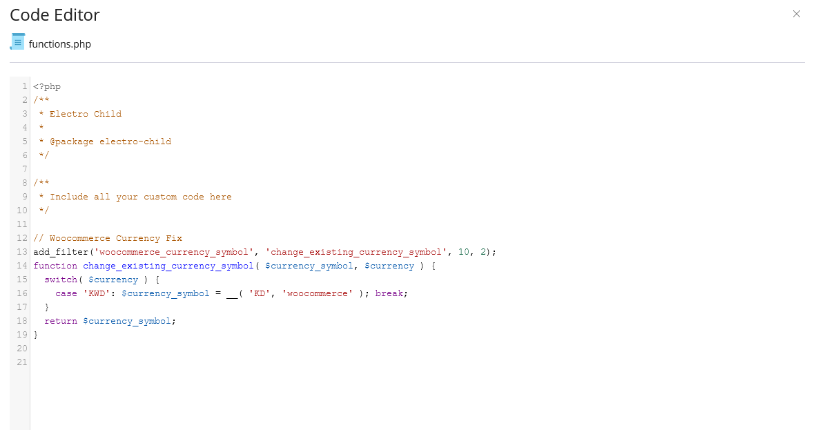 3- Open Functions.php by simply clicking on it and add the following code under the child theme default code if there is any and make sure to change KWD and KD to the currency symbol of your woocommerce settings page: